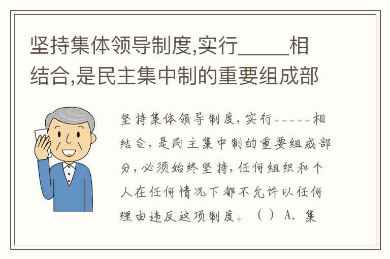 坚持集体领导制度,实行_____相结合,是民主集中制的重要组成部分,必须始终坚持,任何组织和个人在任何情况下都不允许以任何理由违反这项制度。() A. 集体领导和个人分工负责 B. 集中领导和个别分工负责 C. 集体领导和个别分工负责 D. 集中领导和个人分工负责