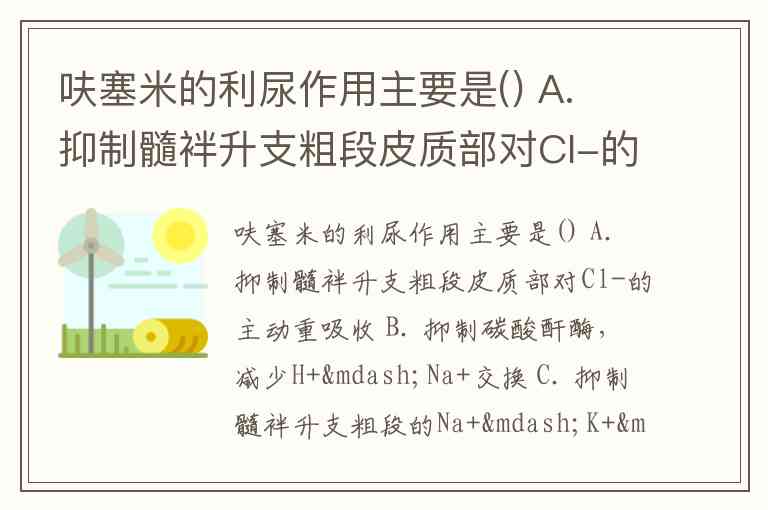 呋塞米的利尿作用主要是() A. 抑制髓袢升支粗段皮质部对Cl-的主动重吸收 B. 抑制碳酸酐酶,减少H+—Na+交换 C. 抑制髓袢升支粗段的Na+—K+—2Cl-同向转运系统 D. 拮抗远曲小管和集合管的醛固酮受体
