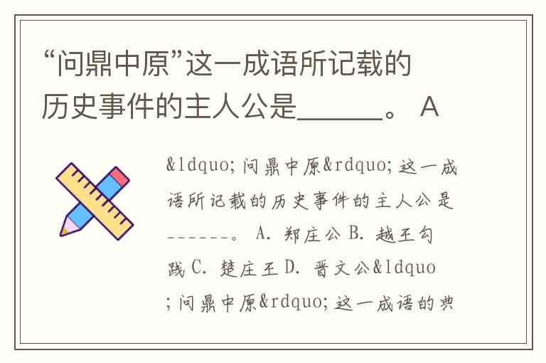 “问鼎中原”这一成语所记载的历史事件的主人公是______。 A. 郑庄公 B. 越王勾践 C. 楚庄王 D. 晋文公