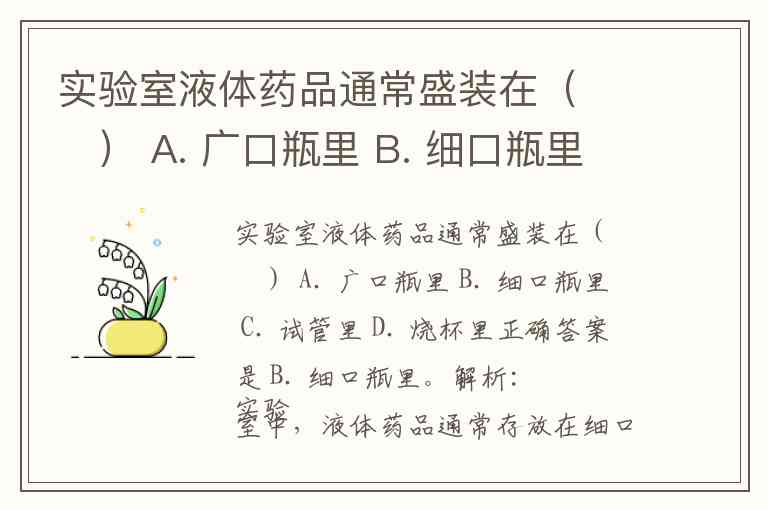 实验室液体药品通常盛装在( ) A. 广口瓶里 B. 细口瓶里 C. 试管里 D. 烧杯里