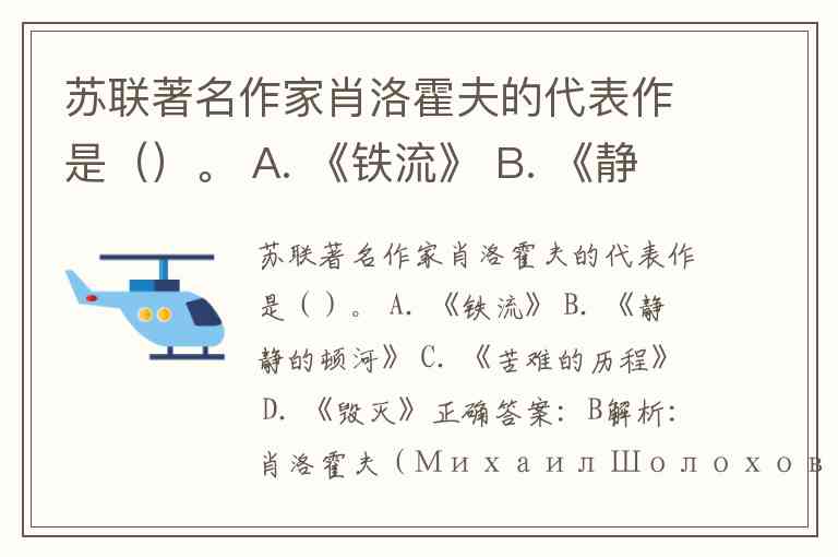 苏联著名作家肖洛霍夫的代表作是()。 A. 《铁流》 B. 《静静的顿河》 C. 《苦难的历程》 D. 《毁灭》