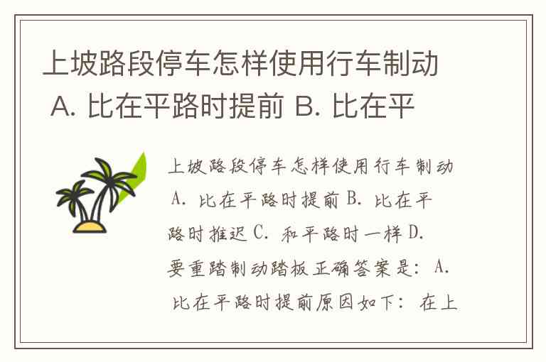 上坡路段停车怎样使用行车制动 A. 比在平路时提前 B. 比在平路时推迟 C. 和平路时一样 D. 要重踏制动踏板