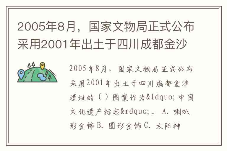 2005年8月,国家文物局正式公布采用2001年出土于四川成都金沙遗址的()图案作为“中国文化遗产标志”。 A. 喇叭形金饰 B. 圆形金饰 C. 太阳神鸟金饰 D. 蛙形金饰