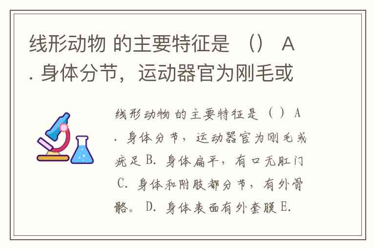 线形动物(如蛔虫)的主要特征是 身体不分节,表面有角质层。
