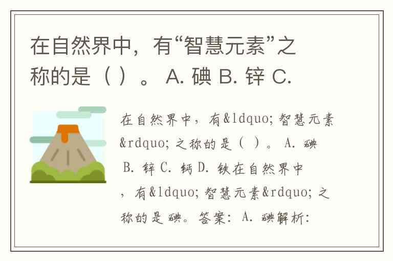 在自然界中,有“智慧元素”之称的是( )。 A. 碘 B. 锌 C. 钙 D. 铁