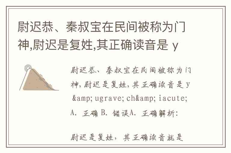 尉迟恭、秦叔宝在民间被称为门神,尉迟是复姓,其正确读音是 y ùchí A. 正确 B. 错误
