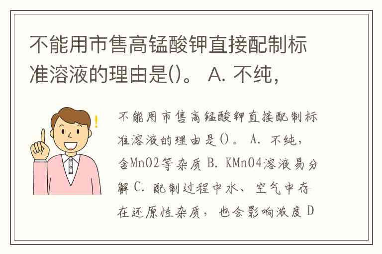 不能用市售高锰酸钾直接配制标准溶液的理由是()。 A. 不纯,含MnO2等杂质 B. KMnO4溶液易分解 C. 配制过程中水、空气中存在还原性杂质,也会影响浓度 D. 由于A、B、C原因,不但不能直接配制标准液,而且配好的溶液,也应于棕色瓶中存放7-10天后再标定