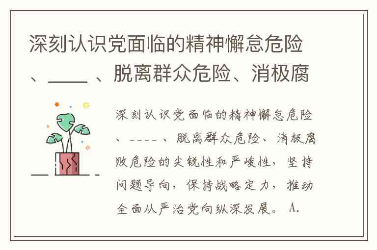 深刻认识党面临的精神懈怠危险、____ 、脱离群众危险、消极腐败危险的尖锐性和严峻性,坚持问题导向,保持战略定力,推动全面从严治党向纵深发展。 A. 封闭僵化危险 B. 危险 C. 形式主义危险 D. 能力不足危险