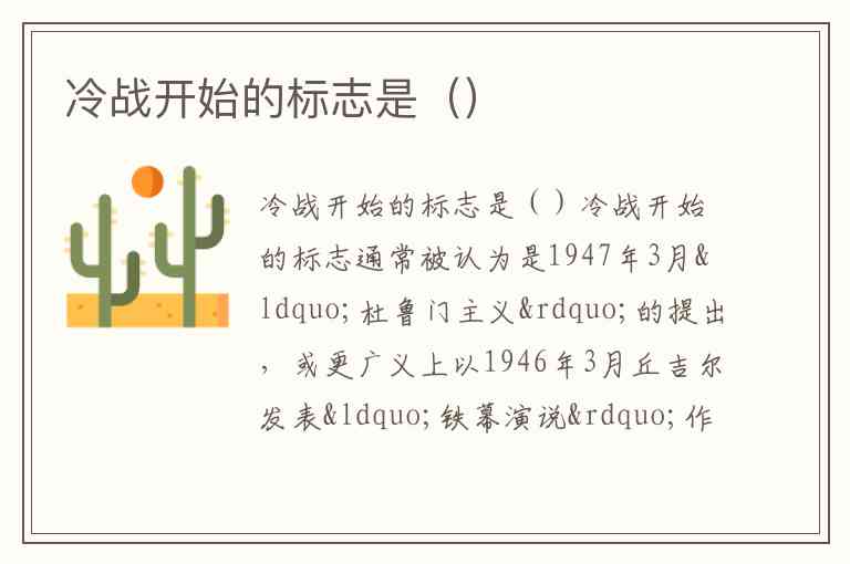 若需在填空题中选择一个最广泛接受的答案,杜鲁门主义通常被视为冷战开始的标志。但需注意,冷战并非由单一事件触发,而是多重矛盾累积的结果。在教学中,常将 1947年杜鲁门主义的提出 作为简明答案。