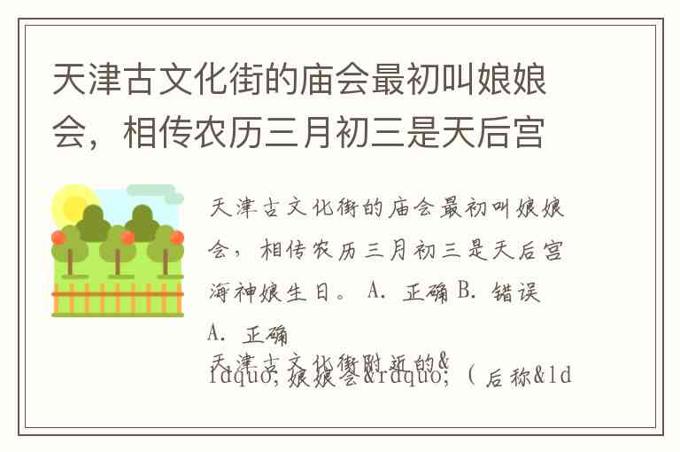 天津古文化街的庙会最初叫娘娘会,相传农历三月初三是天后宫海神娘生日。 A. 正确 B. 错误