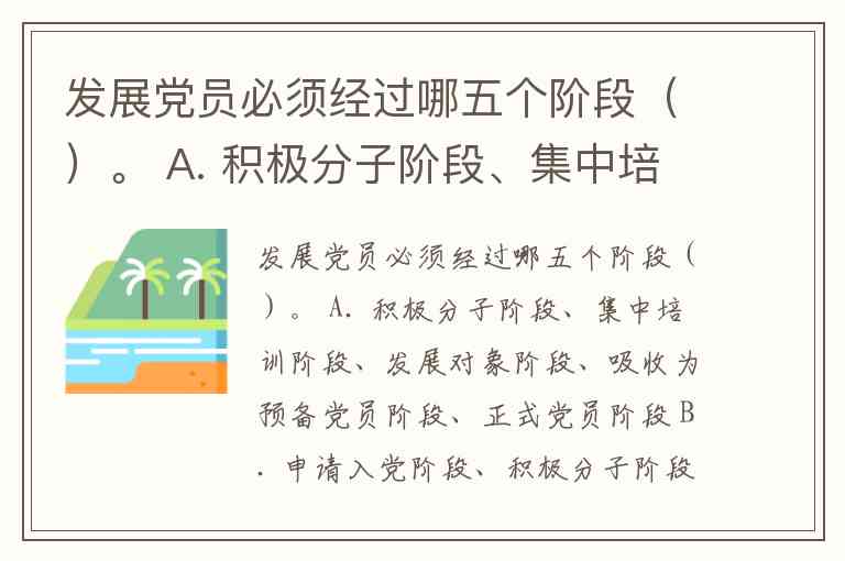 发展党员必须经过哪五个阶段()。 A. 积极分子阶段、集中培训阶段、发展对象阶段、吸收为预备党员阶段、正式党员阶段 B. 申请入党阶段、积极分子阶段、培养考察阶段、吸收为预备党员阶段、正式党员阶段 C. 申请入党阶段、积极分子阶段、发展对象阶段、吸收为预备党员阶段、正式党员阶段 D. 积极分子阶段、集中培训阶段、培养考察阶段、吸收为预备党员阶段、正式党员阶段