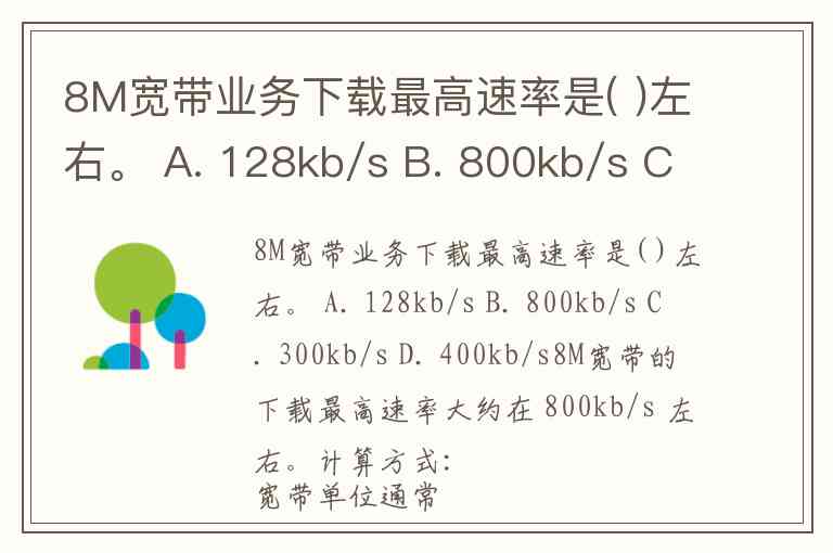 8M宽带业务下载最高速率是( )左右。 A. 128kb/s B. 800kb/s C. 300kb/s D. 400kb/s