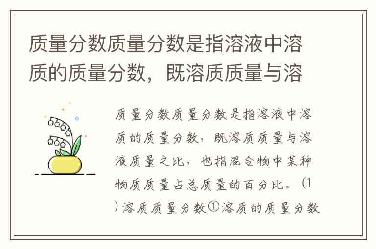质量分数质量分数是指溶液中溶质的质量分数,既溶质质量与溶液质量之比,也指混合物中某种物质质量占总质量的百分比。(1)溶质质量分数①溶质的质量分数只表示溶质质量与溶液质量之比,并不代表具体的溶液质量和溶质质量。②溶质的质量分数一般用百分数表示。③溶质的质量分数计算式中溶质质量与溶液质量的单位必须统一。④计算式中溶质质量是指被溶解的那部分溶质的质量,没有被溶解的那部分溶质质量不能计算在内。(2)某物质中某元素的质量分数即某元素在某物质中所占的比例。通式为:R的相对原子质量×分子中R的个数该分子的相对分子质量×100%。?经典例题某物质在室温下的溶解度为20 g,在室温下将该物质40 g投入90 g水中充分溶解,则该溶液中溶质的质量分数为()。 A. 30.8% B. 44.4% C. 16.7% D. 无法计算