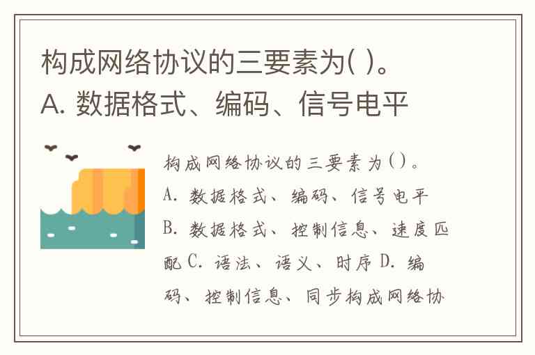 构成网络协议的三要素为( )。 A. 数据格式、编码、信号电平 B. 数据格式、控制信息、速度匹配 C. 语法、语义、时序 D. 编码、控制信息、同步