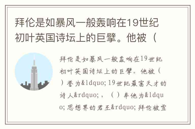 拜伦被雪莱誉为“19世纪最富天才的诗人”,歌德奉他为“思想界的君王”。
