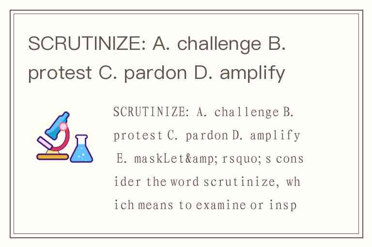 SCRUTINIZE: A. challenge B. protest C. pardon D. amplify E. mask