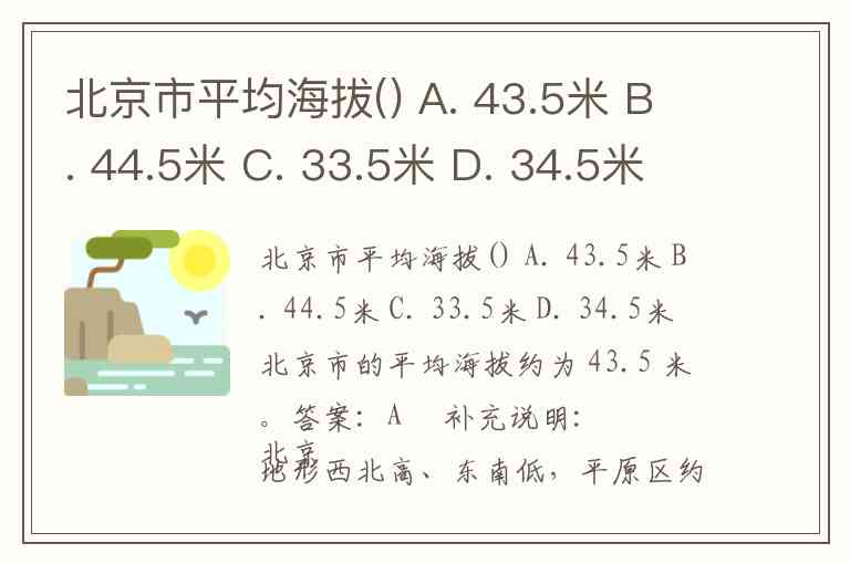 北京市平均海拔() A. 43.5米 B. 44.5米 C. 33.5米 D. 34.5米