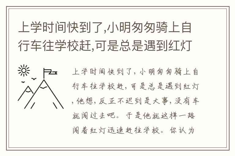 上学时间快到了,小明匆匆骑上自行车往学校赶,可是总是遇到红灯,他想,反正不迟到是大事,没有车就闯过去吧。于是他就这样一路闯着红灯迅速赶往学校。你认为他的做法是( ) A. 合理又合法 B. 合情合理不合法 C. 是违反纪律的行为 D. 是违法行为