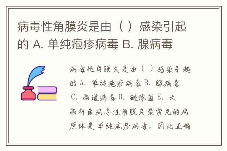 病毒性角膜炎是由( )感染引起的 A. 单纯疱疹病毒 B. 腺病毒 C. 肠道病毒 D. 链球菌 E. 大肠杆菌