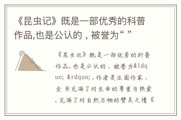 《昆虫记》既是一部优秀的科普作品,也是公认的 , 被誉为“ ”,作者是法国作家 。全 书充满了对生命的尊重与热爱,充满了对自然万物的赞美之情