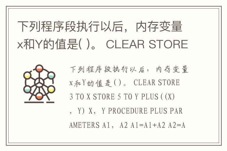 下列程序段执行以后,内存变量x和Y的值是( )。 CLEAR STORE 3 TO X STORE 5 TO Y PLUS((X),Y) X,Y PROCEDURE PLUS PARAMETERS A