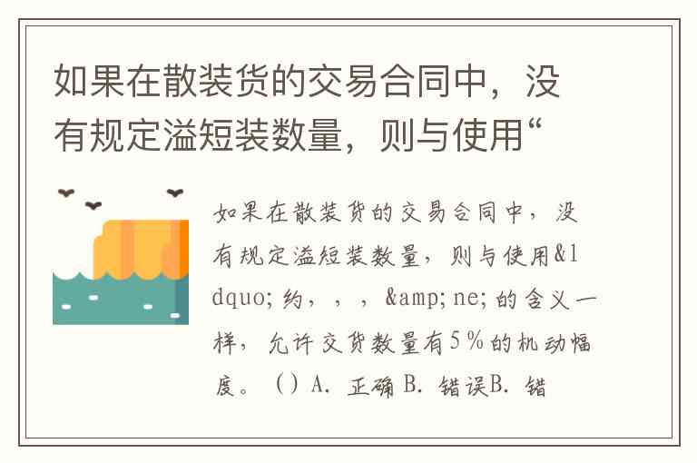 如果在散装货的交易合同中,没有规定溢短装数量,则与使用“约,,,≠的含义一样,允许交货数量有5%的机动幅度。 ( ) A. 正确 B. 错误