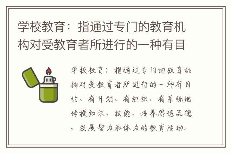 定义:学校教育是指通过专门的教育机构(学校)和专职人员(教师),对受教育者有目的、有计划、有组织、有系统地进行知识传授、技能培养、思想品德塑造,并促进其智力和体力全面发展的教育活动。