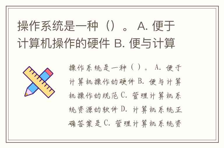 操作系统是一种()。 A. 便于计算机操作的硬件 B. 便与计算机操作的规范 C. 管理计算机系统资源的软件 D. 计算机系统