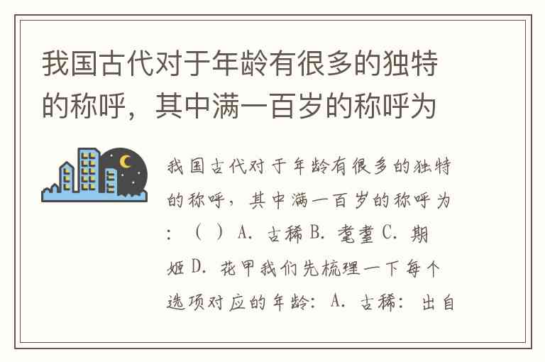 我国古代对于年龄有很多的独特的称呼,其中满一百岁的称呼为:( ) A. 古稀 B. 耄耋 C. 期姬 D. 花甲