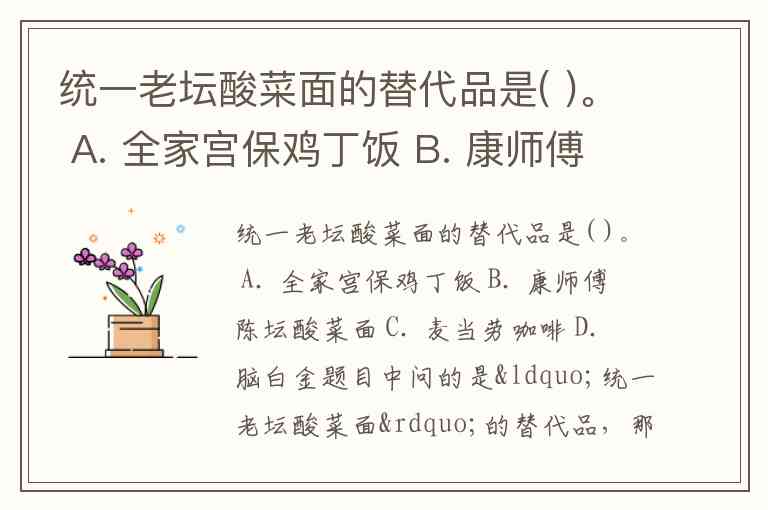 统一老坛酸菜面的替代品是( )。 A. 全家宫保鸡丁饭 B. 康师傅陈坛酸菜面 C. 麦当劳咖啡 D. 脑白金
