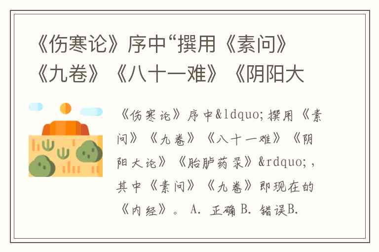 《伤寒论》序中“撰用《素问》《九卷》《八十一难》《阴阳大论》《胎胪药录》”,其中《素问》《九卷》即现在的《内经》。 A. 正确 B. 错误