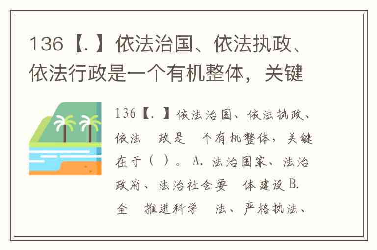 136【. 】依法治国、依法执政、依法⾏政是⼀个有机整体,关键在于( )。 A. 法治国家、法治政府、法治社会要⼀体建设 B. 全⾯推进科学⽴法、严格执法、公正司法、全⺠守法 C. 党要坚持依法执政 D. 各级政府要坚持依法⾏政