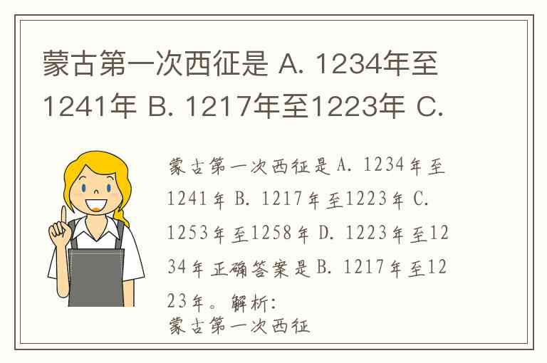 蒙古第一次西征是 A. 1234年至1241年 B. 1217年至1223年 C. 1253年至1258年 D. 1223年至1234年