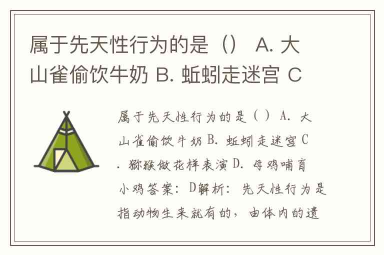 属于先天性行为的是() A. 大山雀偷饮牛奶 B. 蚯蚓走迷宫 C. 猕猴做花样表演 D. 母鸡哺育小鸡