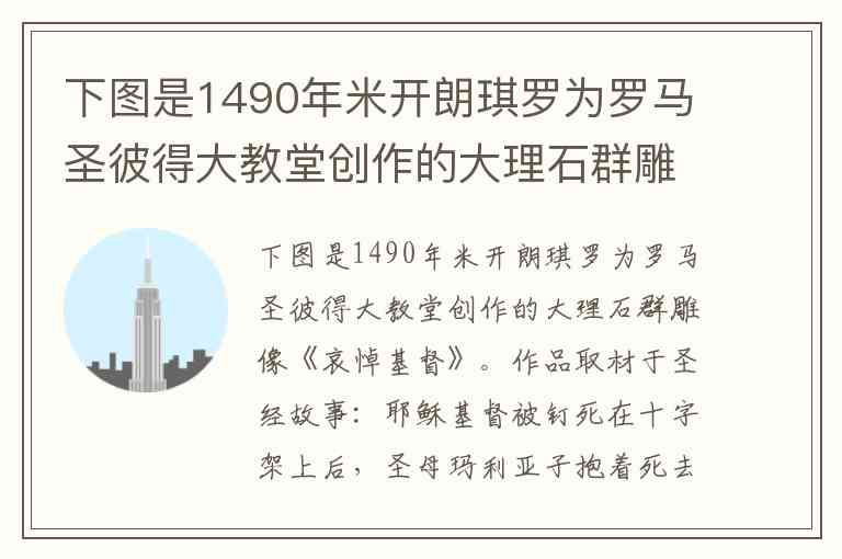 1490 年米开朗琪罗创作的《哀悼基督》是文艺复兴时期的雕塑代表作。虽然题材是宗教性的,但米开朗琪罗以极其写实和人性化的手法刻画了圣母与死去的耶稣,圣母年轻美丽,表情充满深沉的母爱与哀伤,体现了对人性的真实情感和生命尊严的关注,反映了文艺复兴时期人文主义精神,强调人的价值与情感,而非单纯宣扬宗教教义。
