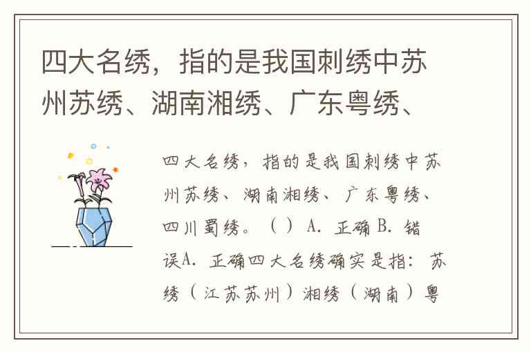 四大名绣,指的是我国刺绣中苏州苏绣、湖南湘绣、广东粤绣、四川蜀绣。() A. 正确 B. 错误