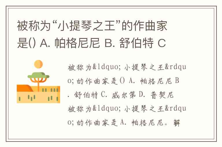 被称为“小提琴之王”的作曲家是() A. 帕格尼尼 B. 舒伯特 C. 威尔第 D. 普契尼