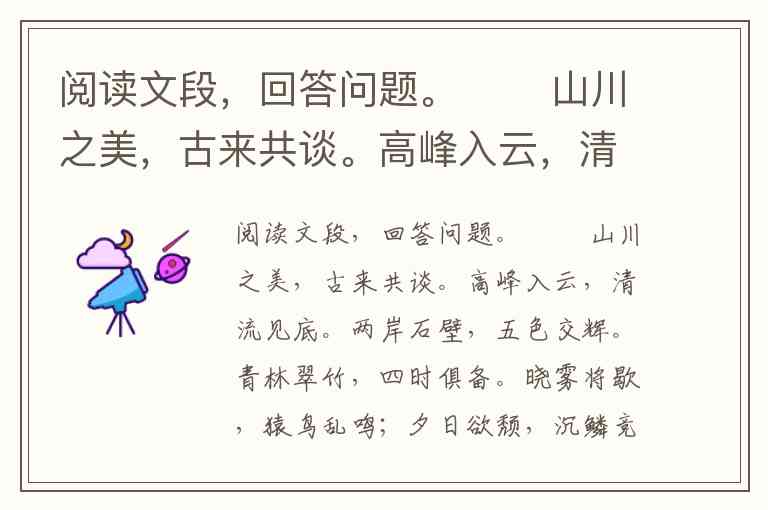 阅读文段,回答问题。 山川之美,古来共谈。高峰入云,清流见底。两岸石壁,五色交辉。青林翠竹,四时俱备。晓雾将歇,猿鸟乱鸣;夕日欲颓,沉鳞竞跃。实是欲界之仙都。自康乐以来,未复有能与其奇者。 1.选出划线字意思不同的一项 [ ] A.高峰入云重岩叠嶂 B.晓雾将歇 朝发白帝 C.青林翠竹 清流见底 D.夕日欲颓不见曦月 2.选出划线字意思相同的一项 [ ] A.与:未复有能与其奇者 选贤与能 B.将:晓雾将歇 出郭相扶将 C.是:实是欲界之仙都 自是指物作诗立就 D.自:自康乐以来 自李唐来 3.选出划线词解释有误的项 [ ] A.古来共谈(谈论) B.五色交辉(交相辉映) C.夕日欲颓(落下) D.未复有能与其奇者(奇怪) 4.选出说法有误的一项 [ ] A.本文是陶弘景给谢中书书信中的一段文字,历来被当作独立成篇的山水佳作来欣赏。 B.全文以“山川之美,古来共谈”为话题,以山峰、河流、石壁、树木等景物的铺陈刻画为主体,最后以无人与之共赏山川之美结束。 C.本文文字清新流畅,精于铸炼,以散句为主,长短结合、骈散交错。 D.文章表达了作者对谢灵运的仰慕之情,也抒发了作者自己欣赏山水时不同凡响的审美感受。