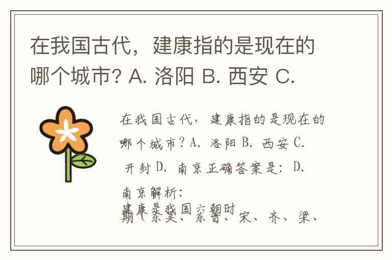 在我国古代,建康指的是现在的哪个城市? A. 洛阳 B. 西安 C. 开封 D. 南京