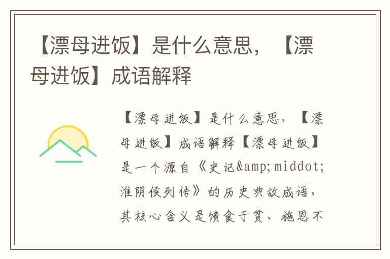 【漂母进饭】是一个源自《史记·淮阴侯列传》的历史典故成语,其核心含义是馈食于贫、施恩不图报,后常用来形容善良之人对身处困境者的无私帮助。