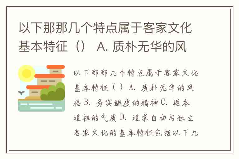 以下那那几个特点属于客家文化基本特征() A. 质朴无华的风格 B. 务实避虚的精神 C. 返本追祖的气质 D. 追求自由与独立