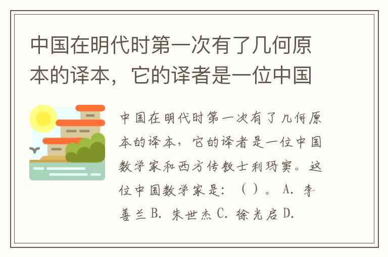 中国在明代时第一次有了几何原本的译本,它的译者是一位中国数学家和西方传教士利玛窦。这位中国数学家是:()。 A. 李善兰 B. 朱世杰 C. 徐光启 D. 杨辉