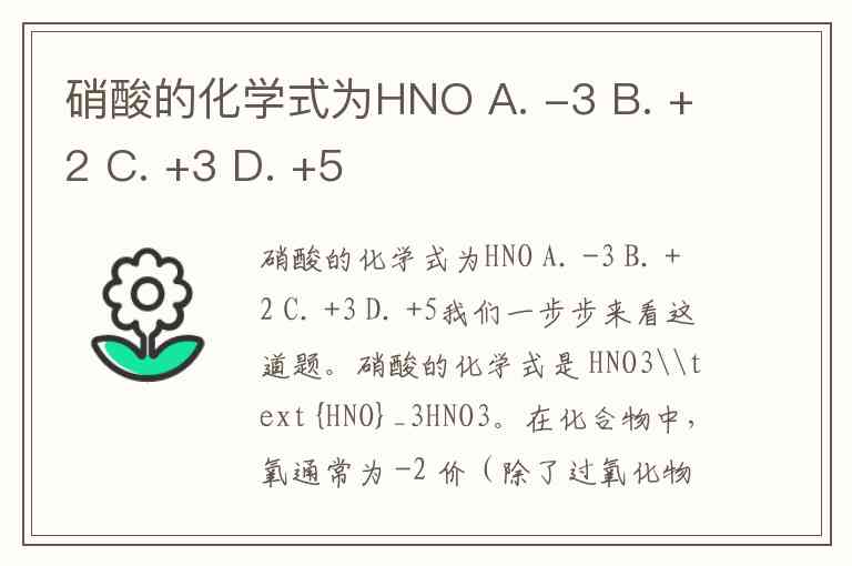 硝酸的化学式为HNO A. -3 B. +2 C. +3 D. +5