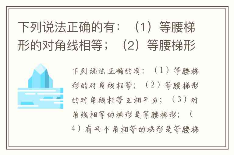 对角线相等是正确的,但“互相平分”意味着梯形是平行四边形,而等腰梯形不是平行四边形(除非是矩形,且矩形也是特殊的等腰梯形),但一般等腰梯形对角线并不互相平分。因此 (2)错误。