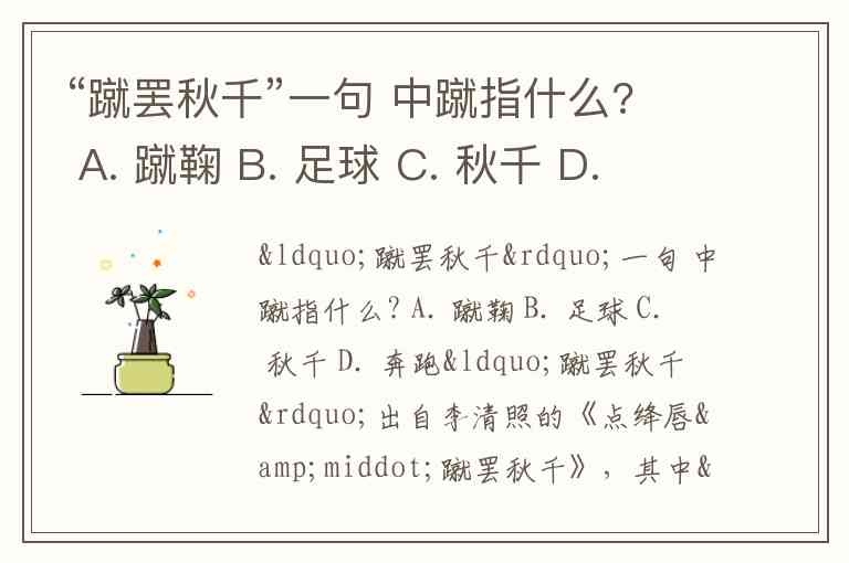 “蹴罢秋千”一句 中蹴指什么? A. 蹴鞠 B. 足球 C. 秋千 D. 奔跑