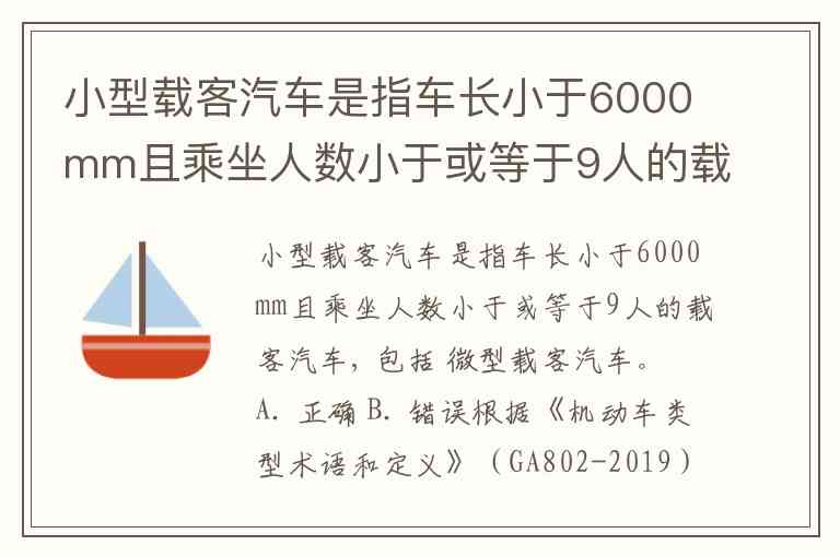 根据《机动车类型术语和定义》(GA802-2019)等相关标准的规定:小型载客汽车指的是车长小于6000mm且乘坐人数小于或等于9人的载客汽车,但不包括微型载客汽车。微型载客汽车(车长 ≤ 3500mm,发动机气缸总排量 ≤ 1000ml)是单独的一类,与小型载客汽车是并列关系。