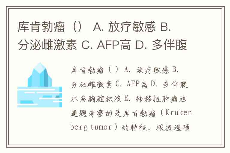 库肯勃瘤() A. 放疗敏感 B. 分泌雌激素 C. AFP高 D. 多伴腹水或胸腔积液 E. 转移性肿瘤