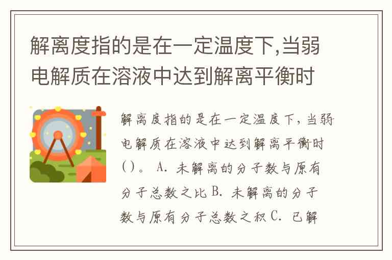 解离度指的是在一定温度下,当弱电解质在溶液中达到解离平衡时( )。 A. 未解离的分子数与原有分子总数之比 B. 未解离的分子数与原有分子总数之积 C. 已解离的分子数与原有分子总数之积 D. 已解离的分子数与原有分子总数之比