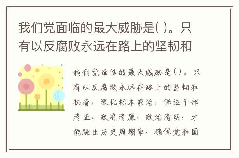 我们党面临的最大威胁是( )。只有以反腐败永远在路上的坚韧和执着,深化标本兼治,保证干部清正、政府清廉、政治清明,才能跳出历史周期率,确保党和国家长治久安。 (A) A. 腐败 B. 脱离群众 C. 能力不足 D. 作风问题