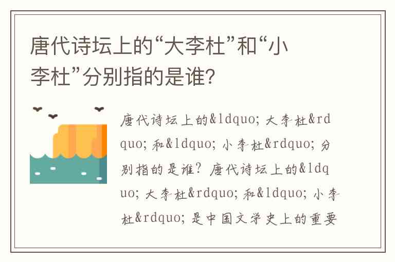合称原因:两人活跃于晚唐,诗歌创作各具特色,在李白、杜甫之后的唐代诗坛具有重要影响力。为区别于盛唐的“李杜”,后世称他们为“小李杜”。
